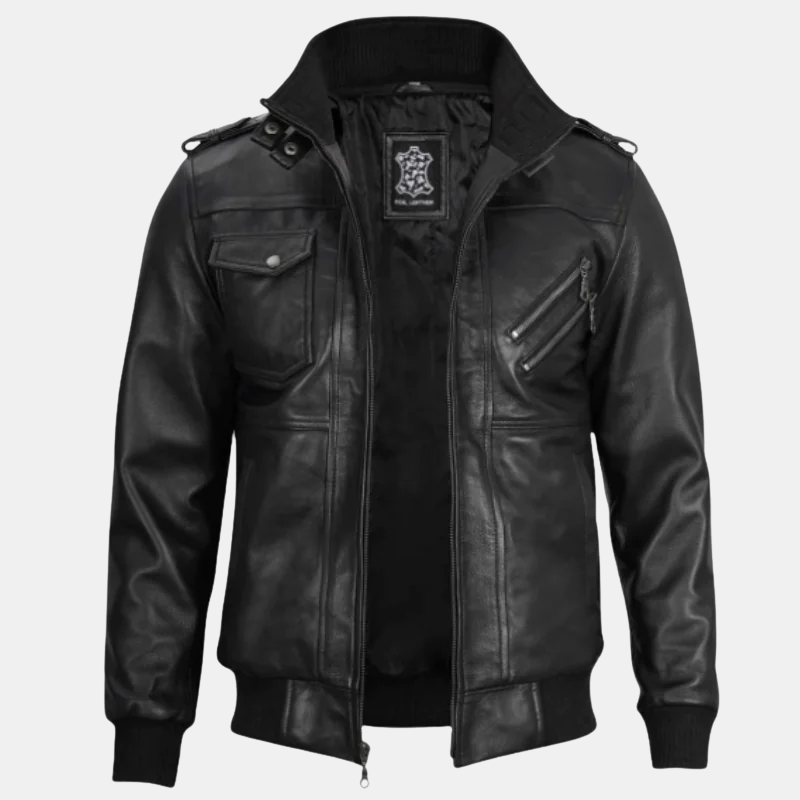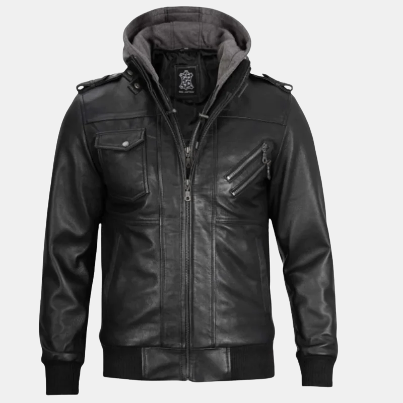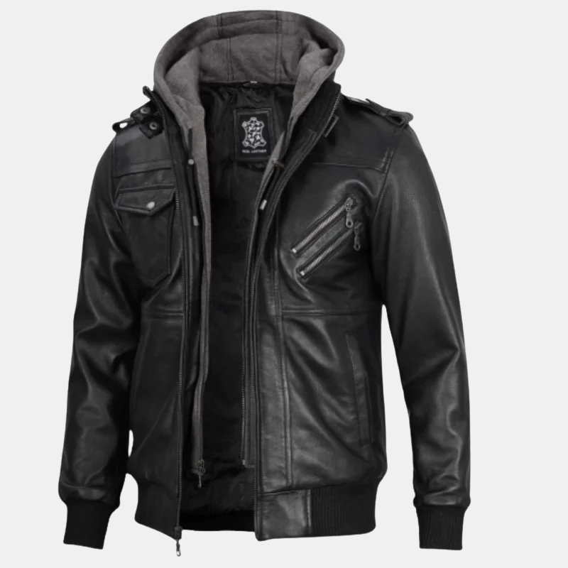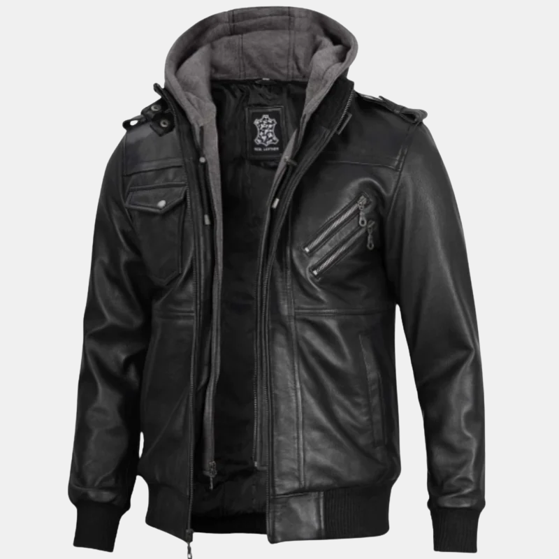 Black Bomber Men’s Leather Jacket with Removable Hood