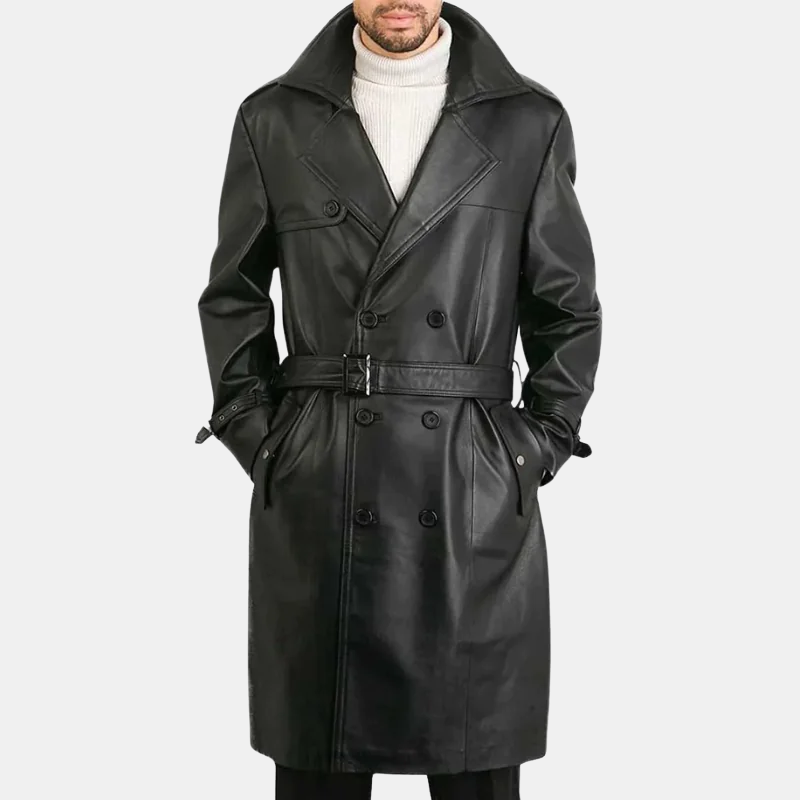 Men’s Belted Double Breasted Black Leather Trench Coat Timeless Sophistication, Rugged Confidence