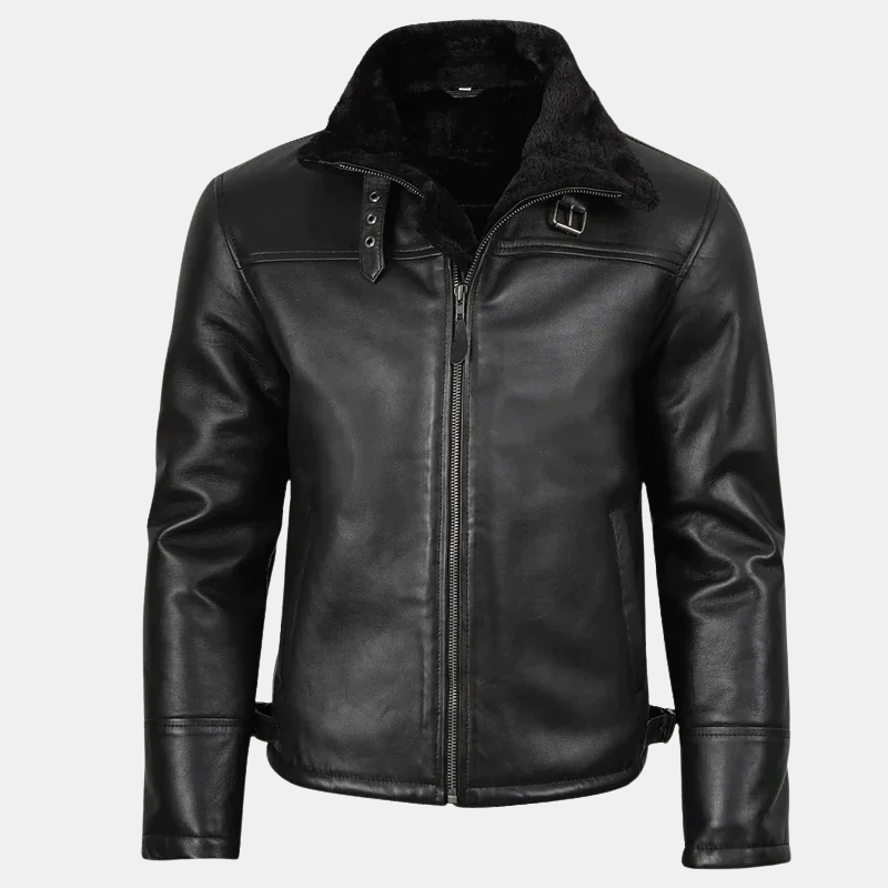 Made from 100% genuine leather, the leather shearling bomber jacket features a plush inner lining of soft faux shearling that keeps you warm even in the harshest cold. Its sleek black finish adds a versatile appeal, allowing you to pair it with anything from jeans to tailored pants. Whether you’re heading to work or out for a night in the city, this shearling bomber jacket mens option keeps you stylishly ahead.