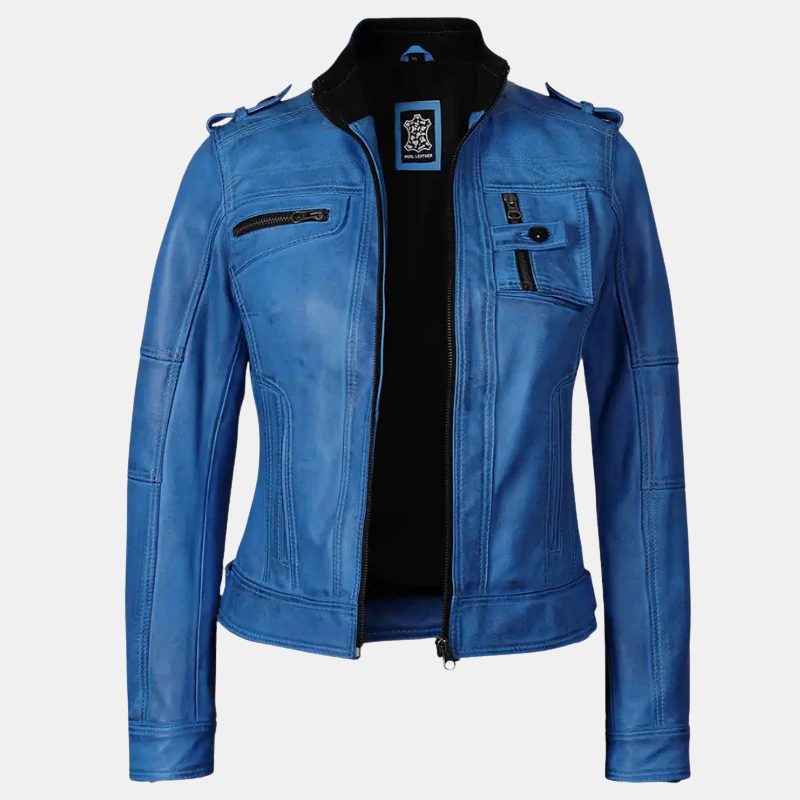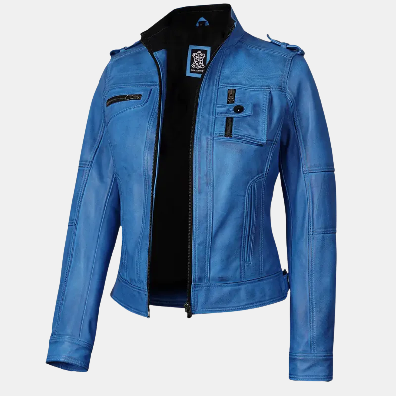 Tavares Women’s Blue Distressed Leather Moto Jacket – Bold. Edgy. Unapologetically You.