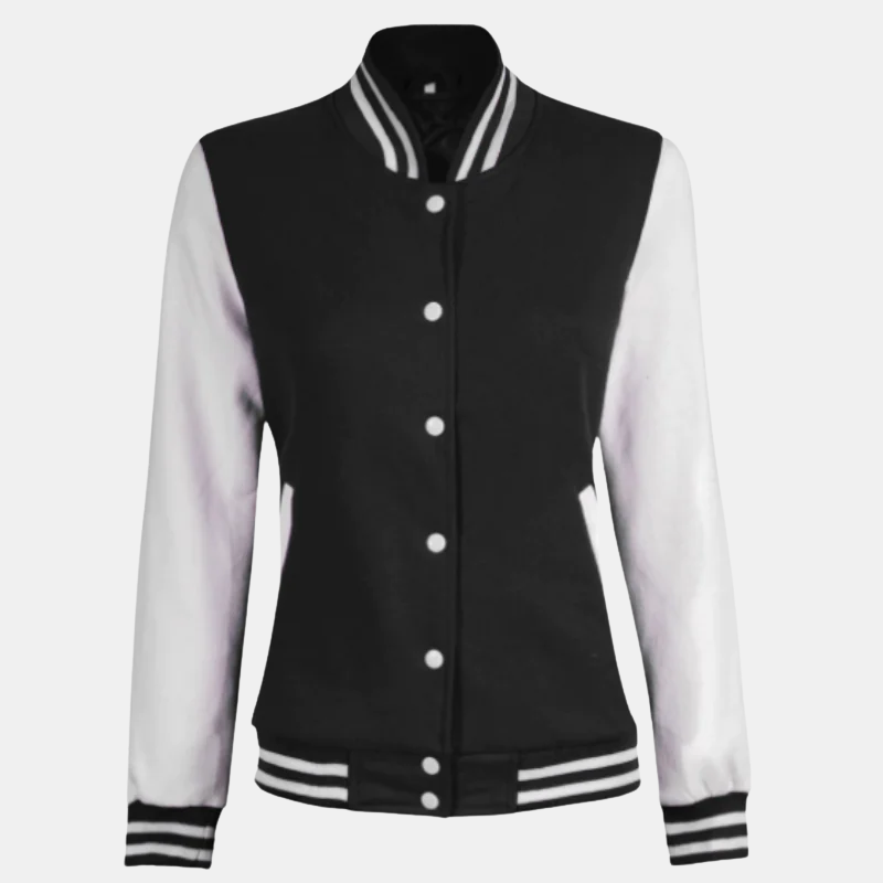 The jacket is black and white. This jacket will be more than an outer garment. It’s a declaration of uniqueness. The intricate stitching and varsity-style look give you a vintage style that makes it an outstanding in a black and white outfit that women can wear. With ribbed cuffs and collar and hem, you’ll get an incredibly snug fit that helps keep cool and your fashion in control.