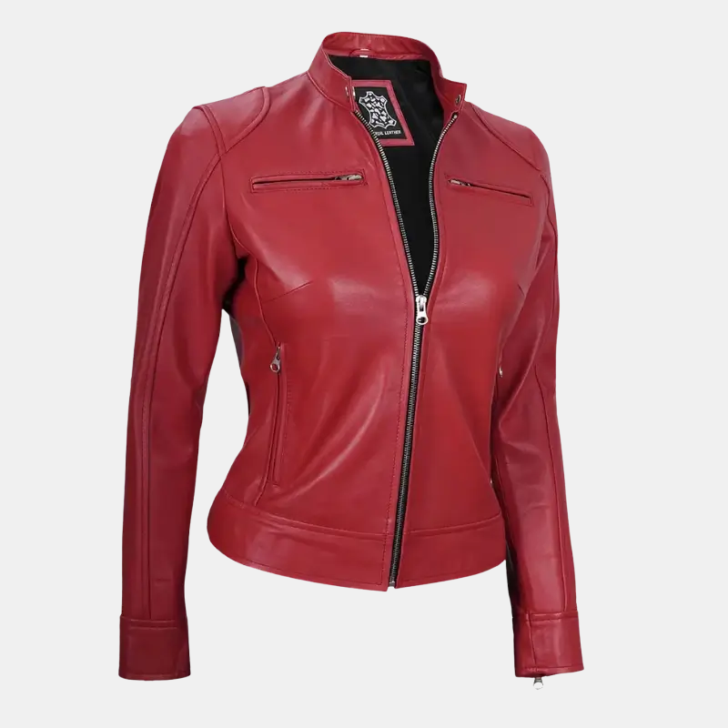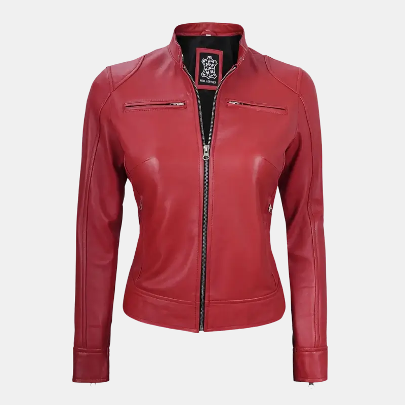 Make a statement with the Women’s Red Dodge Café Racer Leather Jacket, a perfect blend of style, attitude, and elegance. Crafted from premium genuine leather, this jacket is designed for women who love to stand out while embracing a sleek and sophisticated look.